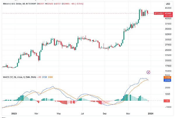 现在让我们来看看BTC的技术面。日线图上连续收阳,但指标却出现了背离。这种"该跌不跌"的走势,最容易让人判断失误。还记得10月份那次吗?指标死叉后,价格不仅没跌,反而一路狂飙到38000。所以现在这个阶段,我建议大家:
